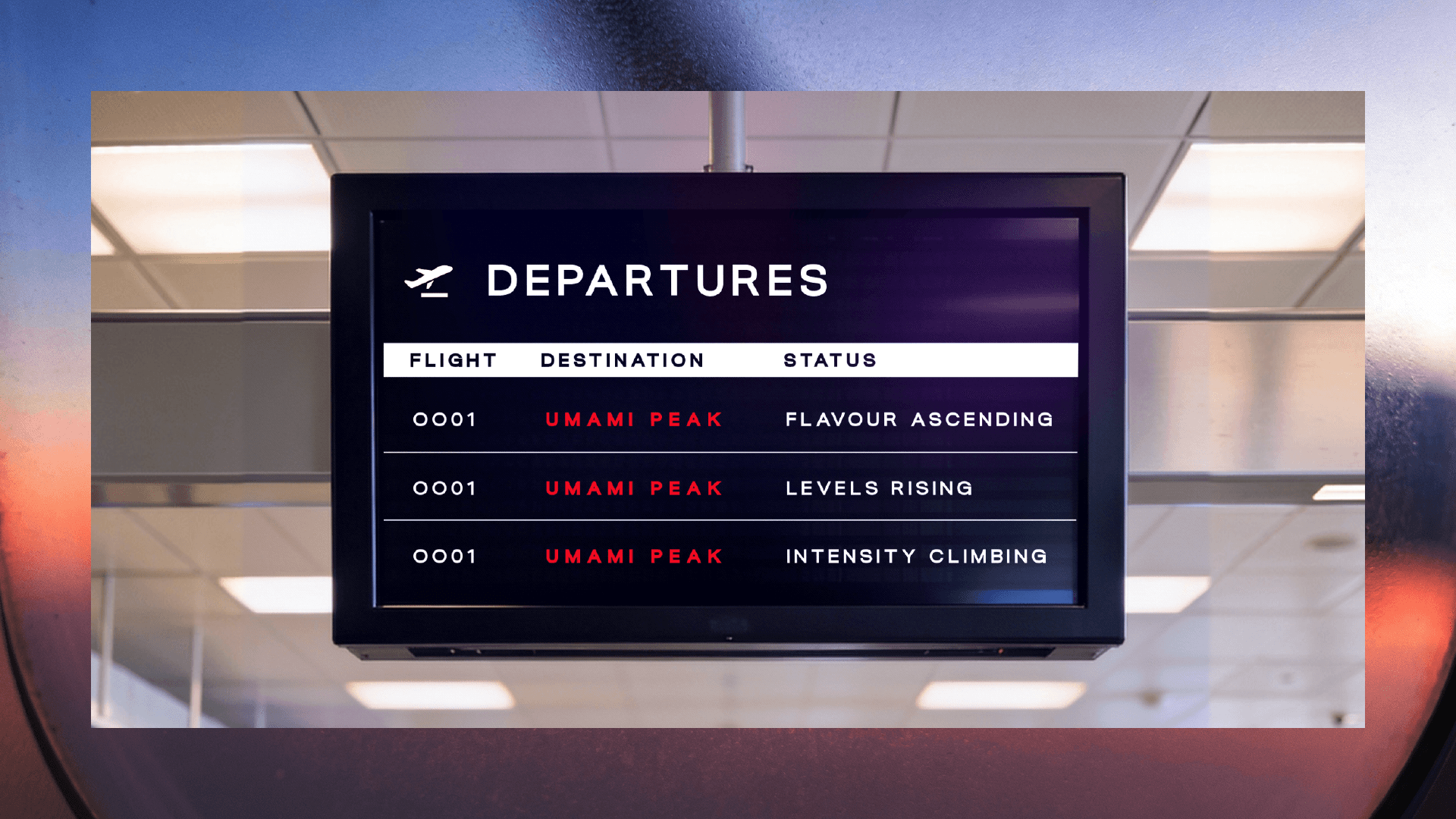 Umami, especially tomato-based flavour, holds intensity better than sweet or salty tastes, making it ideal for air travel. Every visual decision responds to how flavour behaves in flight, not how drinks are branded on the ground.