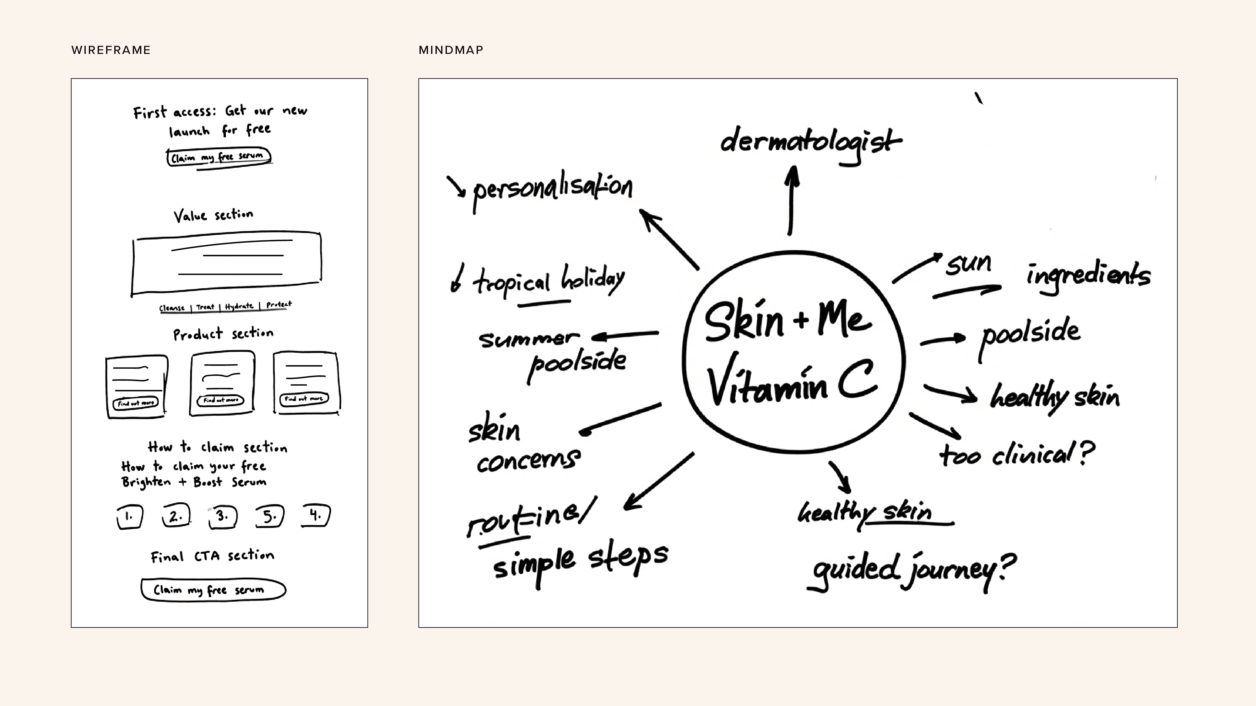 I began by mapping ideas and quick wireframes to define the key pain points and opportunities within Skin+Me’s offer. This helped clarify how personalisation, guidance, and routine structure could translate into a clearer user journey, particularly for the newsletter, where hierarchy and flow are critical for conversion. The wireframes acted as a planning tool to prioritise content, CTA placement, and information order before moving into visual design.