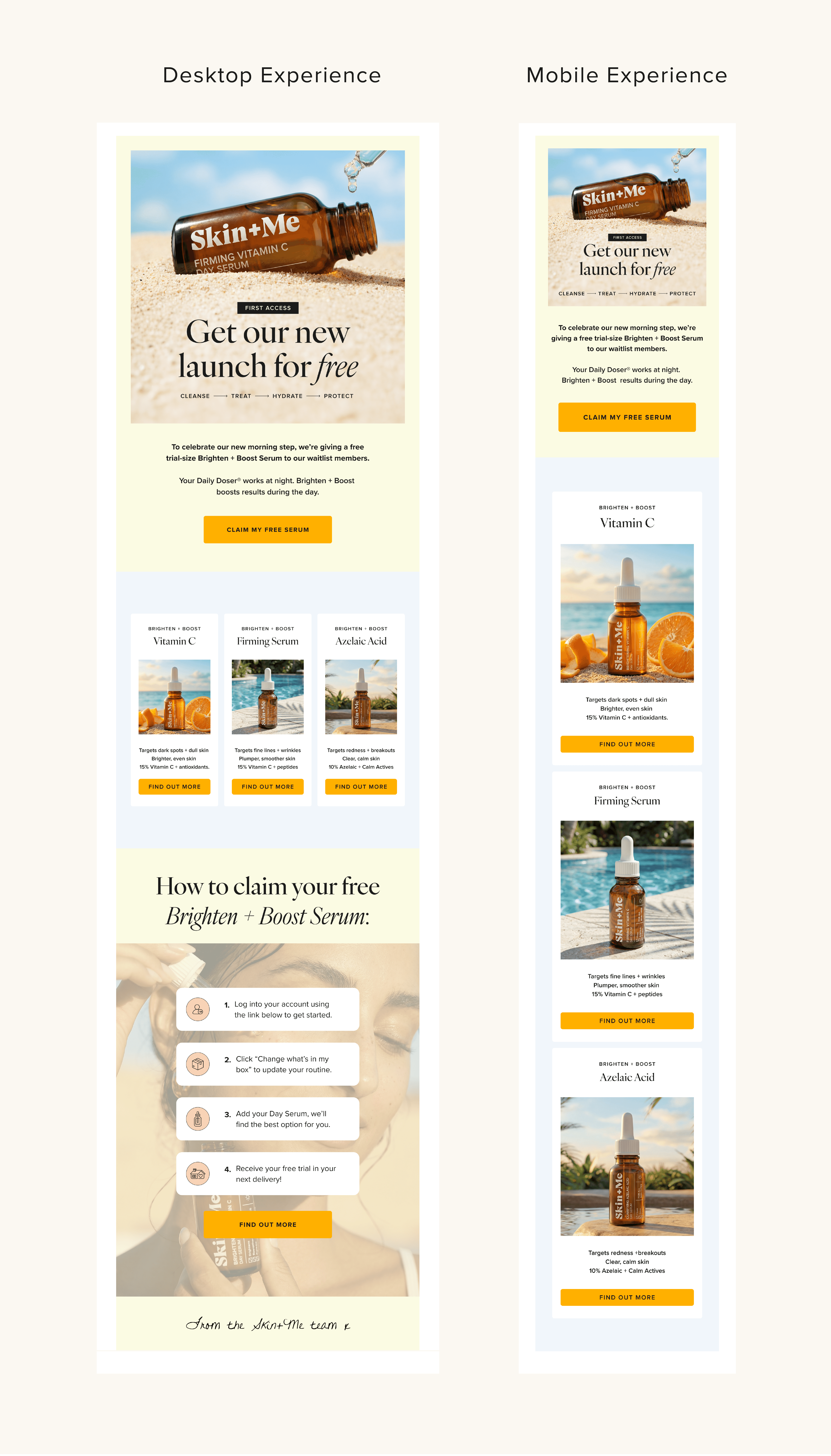 The layout was simplified so the launch and offer are clear at a glance, with defined product sections and strong CTA moments. Subtle hero motion draws attention to the serum texture, helping the email feel more premium and noticeable in a crowded inbox.